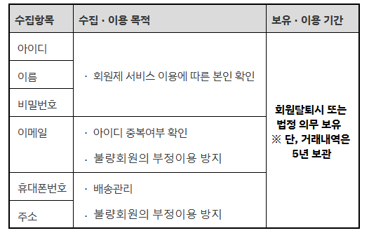 ・ 필수사항 : 이름, 생년월일, 성별, 로그인 ID(회원의 경우), ID 비밀번호(회원의 경우), 휴대전화 번호, 주소, 이메일 주소, DI정보, SMS/TM 수신여부, 이메일 수신여부